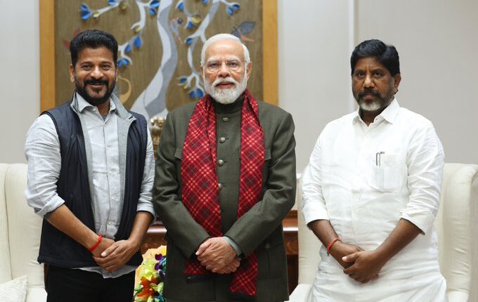 “तेलंगाना के मुख्यमंत्री रेवंत रेड्डी ने उपमुख्यमंत्री भट्टी विक्रमार्क मल्लू के साथ प्रधानमंत्री नरेन्द्र मोदी से मुलाकात की।”